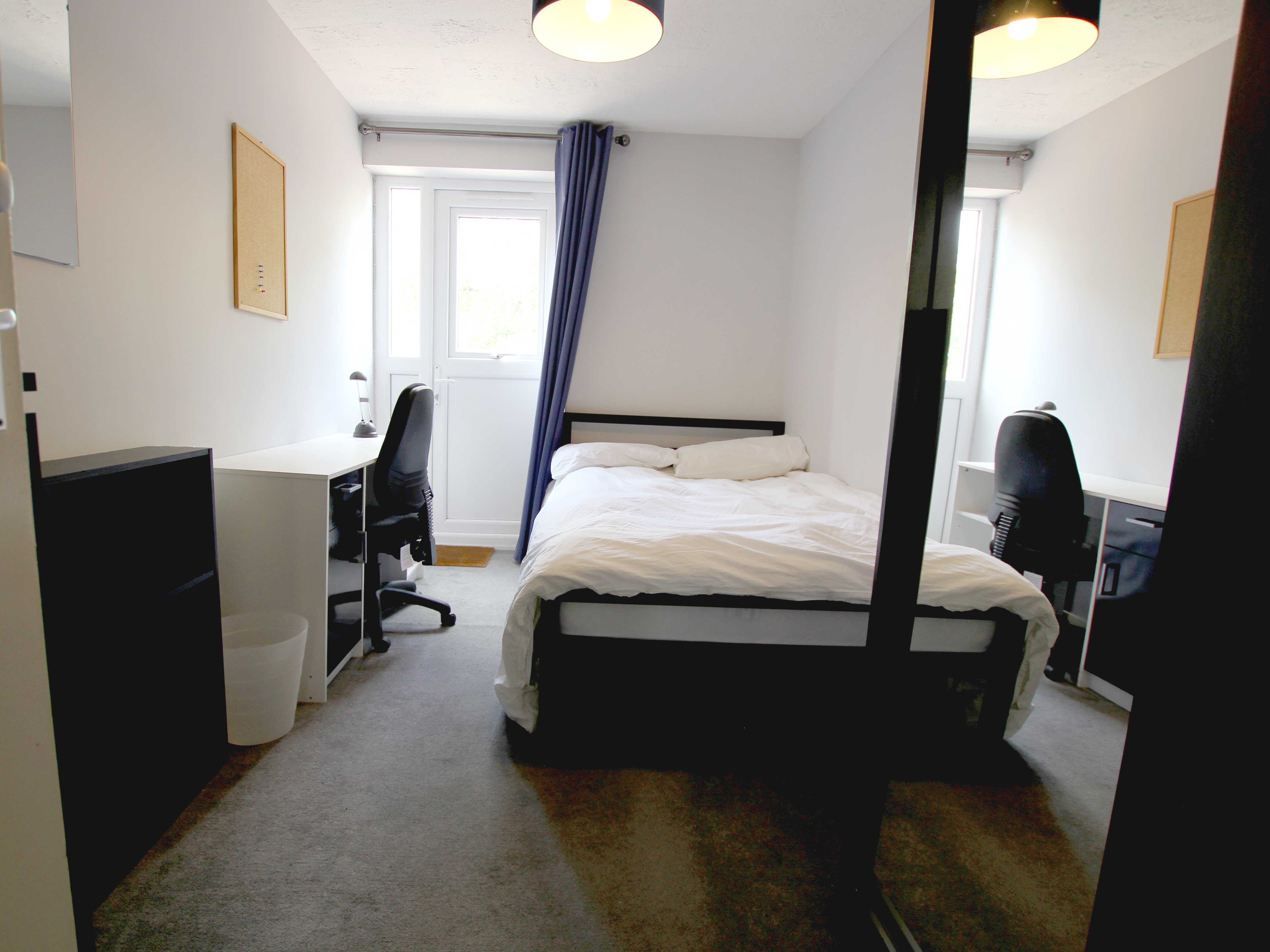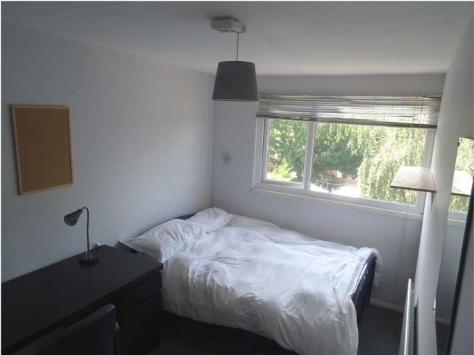 Good sized double bedroom with direct access to garden, sunny aspect. Wardrobe, chest of drawers and desk.