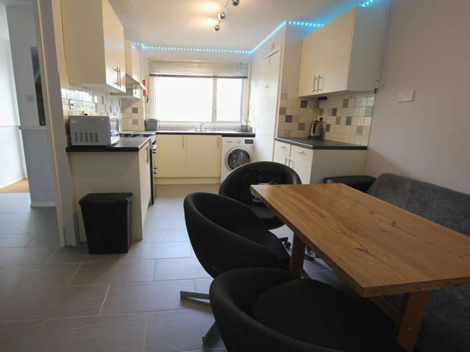 Modern kitchen with plenty of cupboard space and top specification washer/drier machine.